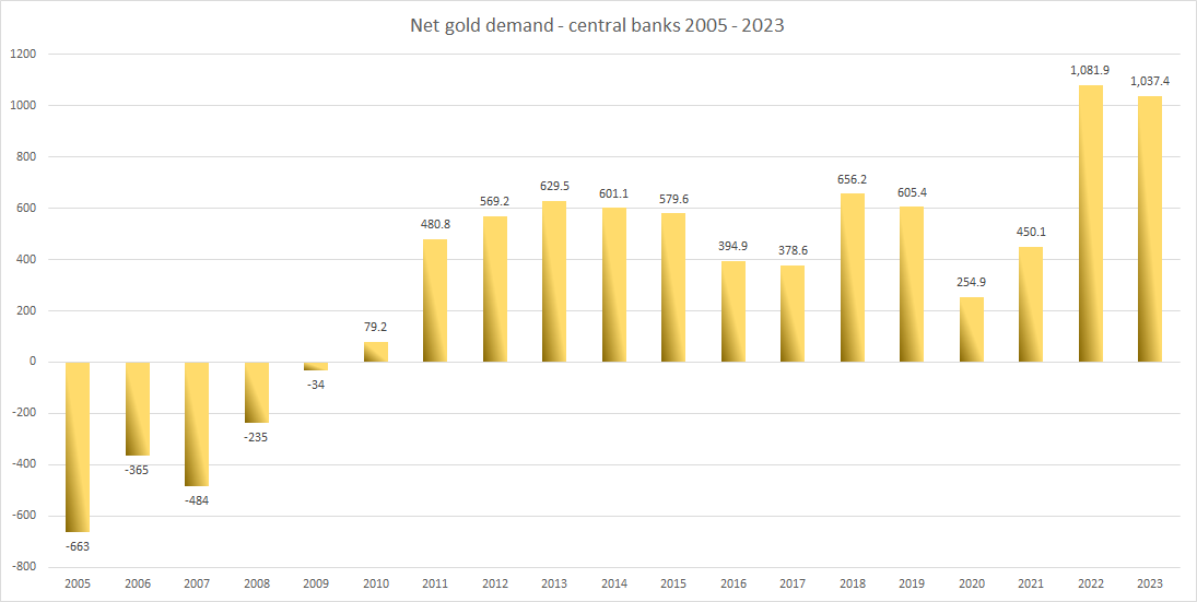 Net gold demand by central banks – 2005 – 2023. Compiled based on WGC data. Source: World Gold Council