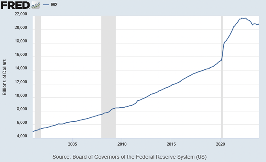 Nadpłynność pieniądza w gospodarce mierzona agregatami M została w przypadku USA złagodzona, a nawet spadła. Przedstawione powyżej M2 jest najszerszym dostępnym agregatem dla USA, ponieważ kilka lat temu podjęto decyzje o nie mierzeniu najszerszego M3. M2 mierzy zasób pieniądza w USA, który obejmuje M1 (waluta i monety przechowywane przez społeczeństwo niebędące bankami, depozyty czekowe i czeki podróżne) plus depozyty oszczędnościowe (w tym rachunki depozytowe rynku pieniężnego), małe depozyty terminowe poniżej 100 tys. dolarów oraz jednostki uczestnictwa w detalicznych funduszach inwestycyjnych rynku pieniężnego.
