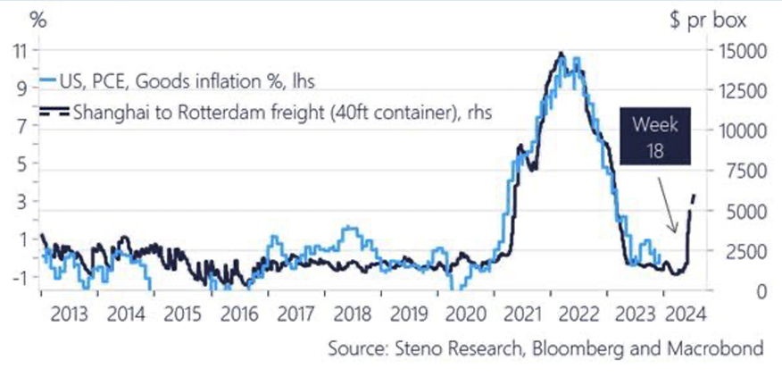 Międzynarodowe stawki frachtowe a inflacja towarowa. Źródło: https://twitter.com/JanGold_/status/1749162226827608192
