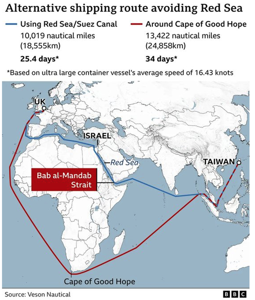 Długość trasy z Tajwanu do Wielkiej Brytanii via Morze Czerwone a Przylądek Dobrej Nadziei. Źródło: BBC