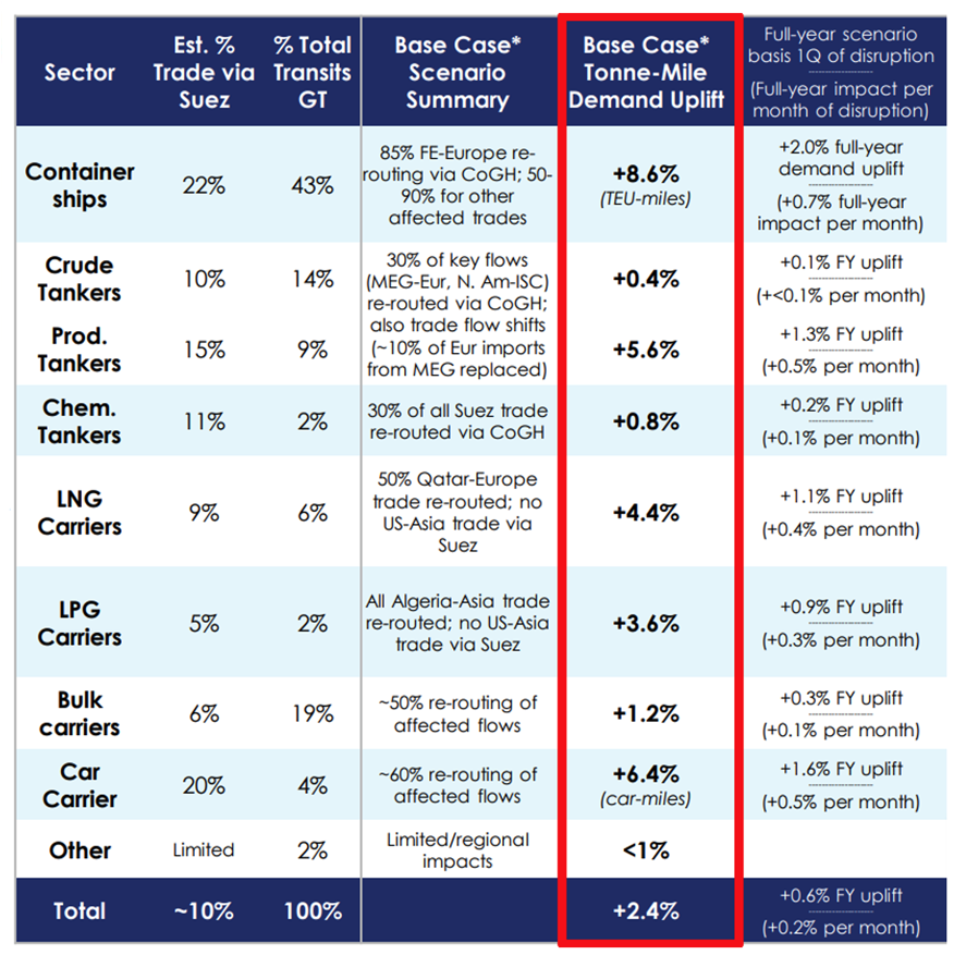 Oczywiście spowodowało to wzrost cen dla statków transportowych różnego rodzaju. Clarkson's szacuje, jak może ulec zmianie cena tono-mili w przypadku przekierowania statku wokół Przylądka Dobrej Nadziei. Niestety, ale nowy koszt jak w tabeli poniżej, dokłada się do uprzedniego wzrostu spowodowanego banem na rosyjskie produkty naftowe, który wyniósł 5-6%. Do tego dochodzą większe koszty ubezpieczenia, usługi etc. i w rezultacie koszt 40-stopowego kontenera wzrasta o 260% w przeciągu miesiąca.