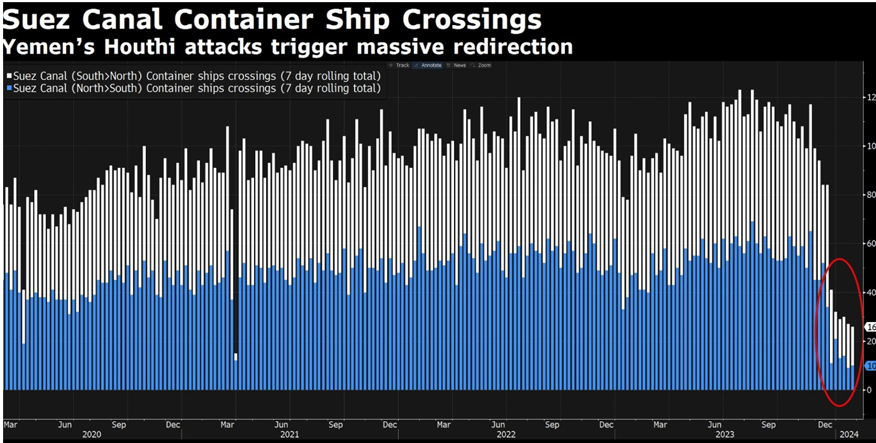 Przeprawy kontenerowców przez Kanał Sueski spadły. Źródło: https://twitter.com/TheStalwart/status/1750160990187012203