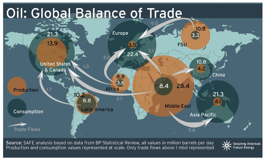 Mapa regionalnych nierównowag na rynku ropy naftowej. Należy pamiętać, że mapa pokazuje dane na 2021 r., stąd też Rosja pozostaje tu bezpośrednim dostawcą do Europy. Ideą jest jednak pokazanie nierównowagi między produkcją a konsumpcją oraz tego, kto jest najbardziej podatny na szoki cenowe związane z ropą naftową. Źródło: SAFE