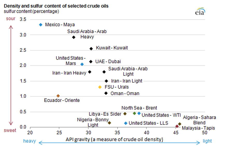 Podstawa dla zrozumienia różnic gatunkowych ropy. Źródło: EIA