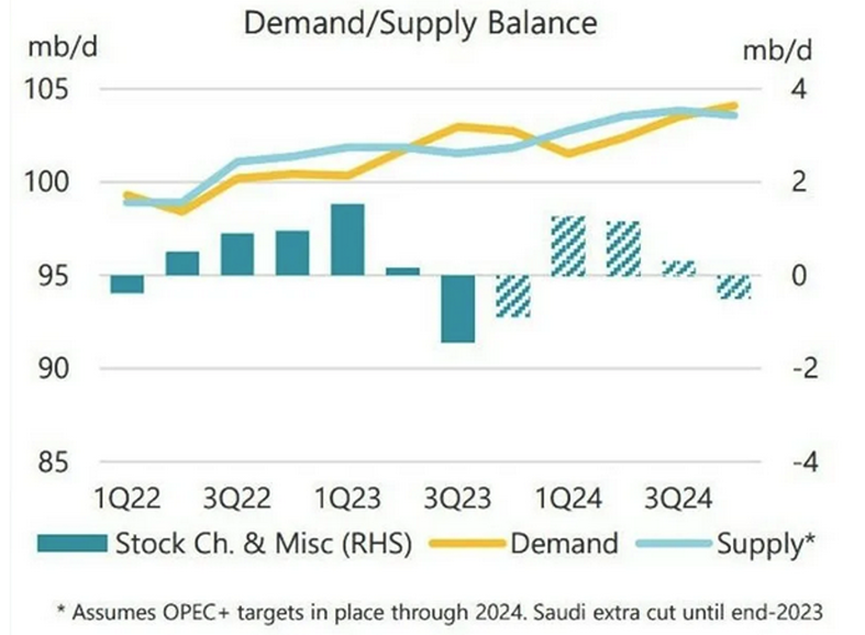 Bilans popytu/podaży ropy naftowej na koniec 3. kwartału 2023 r. Źródło: Oil & Gas Journal