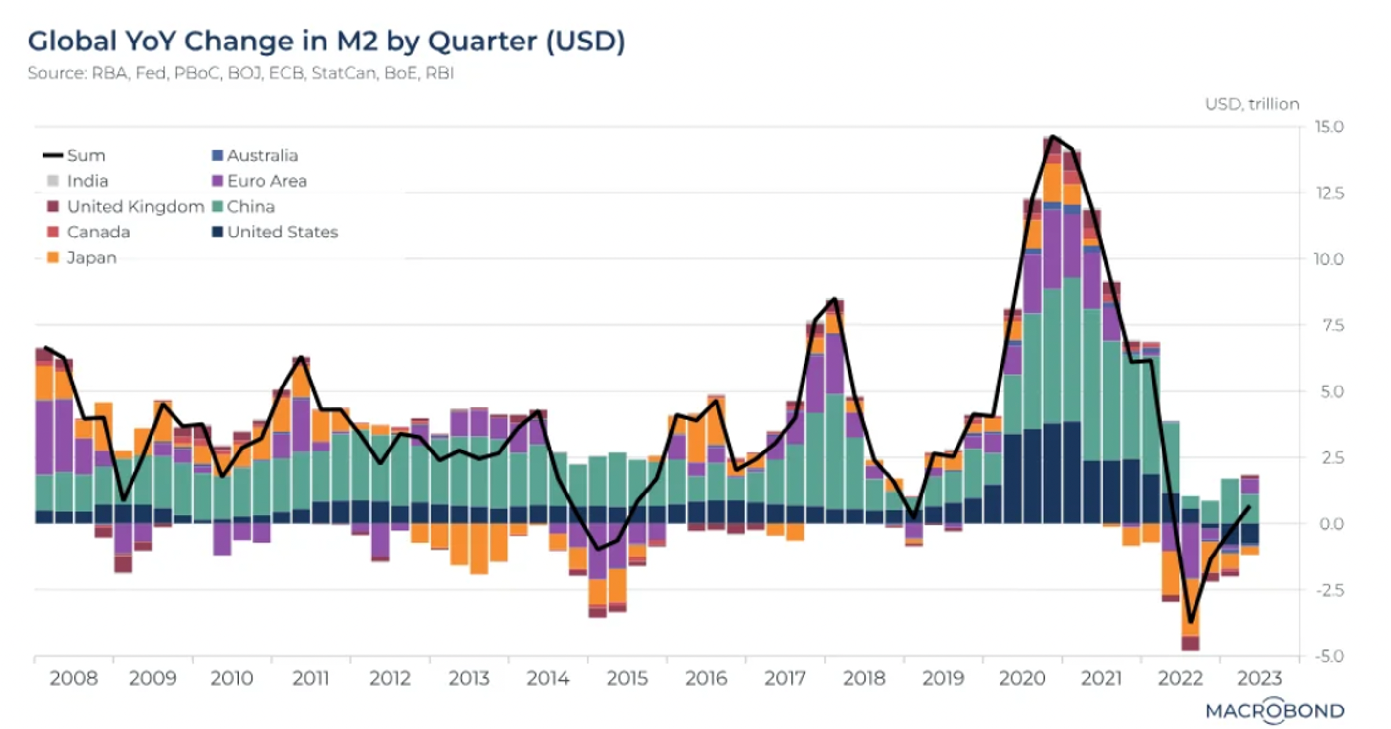Globalna zmiana M2 kwartalnie, do końca 2. kwartału 2023 r. Źródło: Macrobond