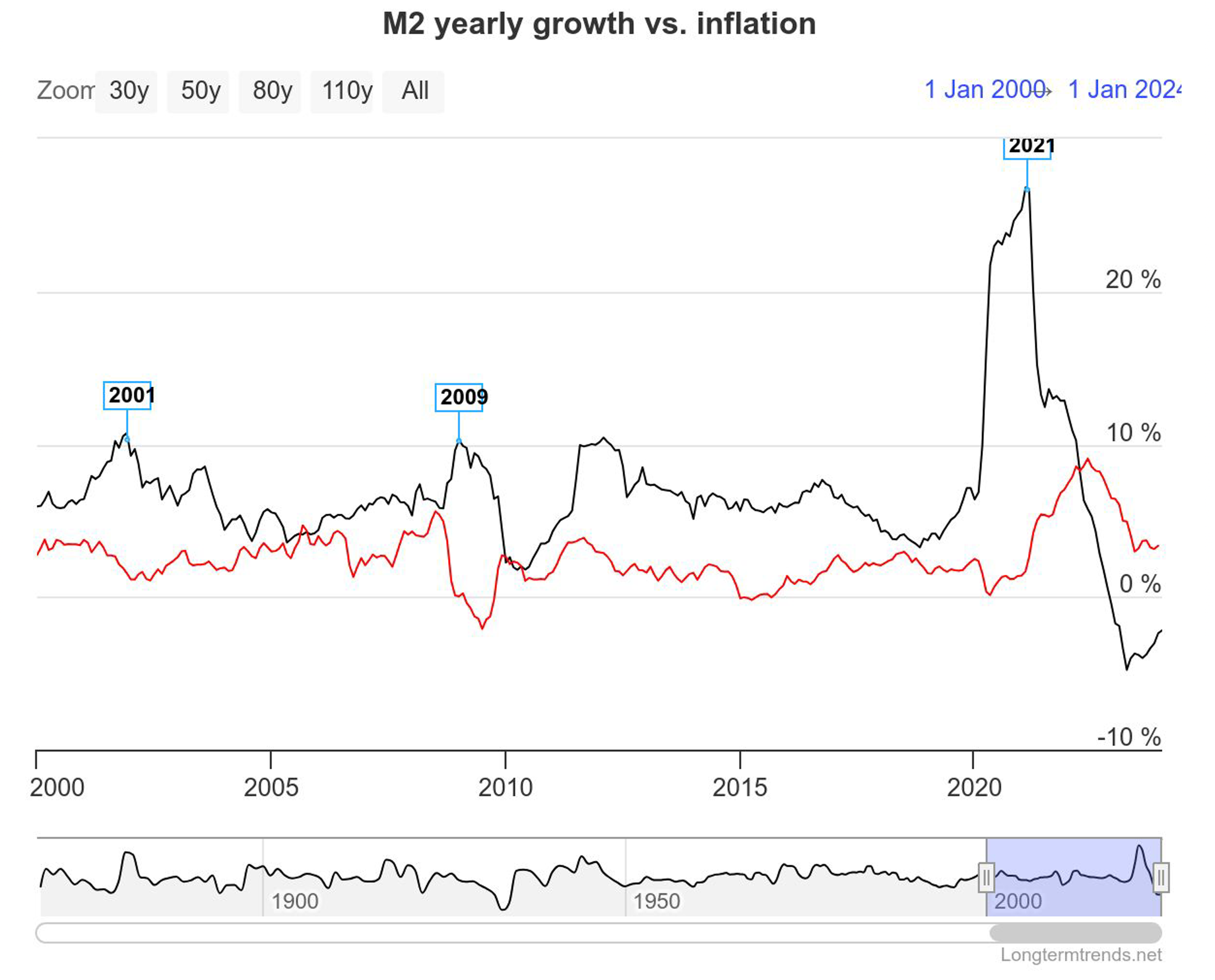 Wzrost podaży pieniądza M2 a inflacja. Źródło: https://www.longtermtrends.net/m2-money-supply-vs-inflation/