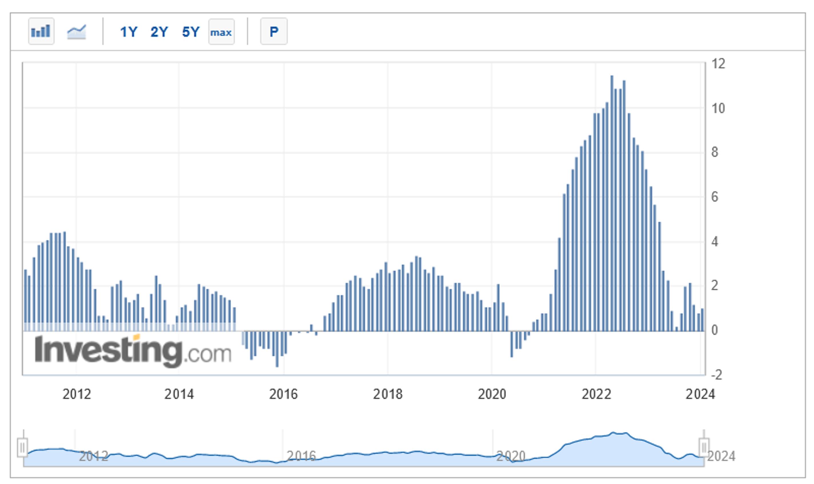 No i oczywiście nie zapominajmy o wskaźniku cen producentów. PPI mierzy koszty produkcji dóbr konsumpcyjnych, ceny towarów i żywności bezpośrednio wpływają na ceny detaliczne, PPI jest uważany za dobry wskaźnik wstępny presji inflacyjnej. Jeśli koszty produkcji wzrosną, część z nich zostanie zaabsorbowana przez producentów, a część (większość) zostanie przeniesiona na konsumentów. I odwrotnie, jeśli koszty nakładów spadną, część spadku zostanie wykorzystana przez producentów, jako szersze marże zysku, a część zostanie przeniesiona na konsumentów w postaci niższych cen. Ponownie, wskaźnik PPI wydaje się być ostatnio umiarkowany.