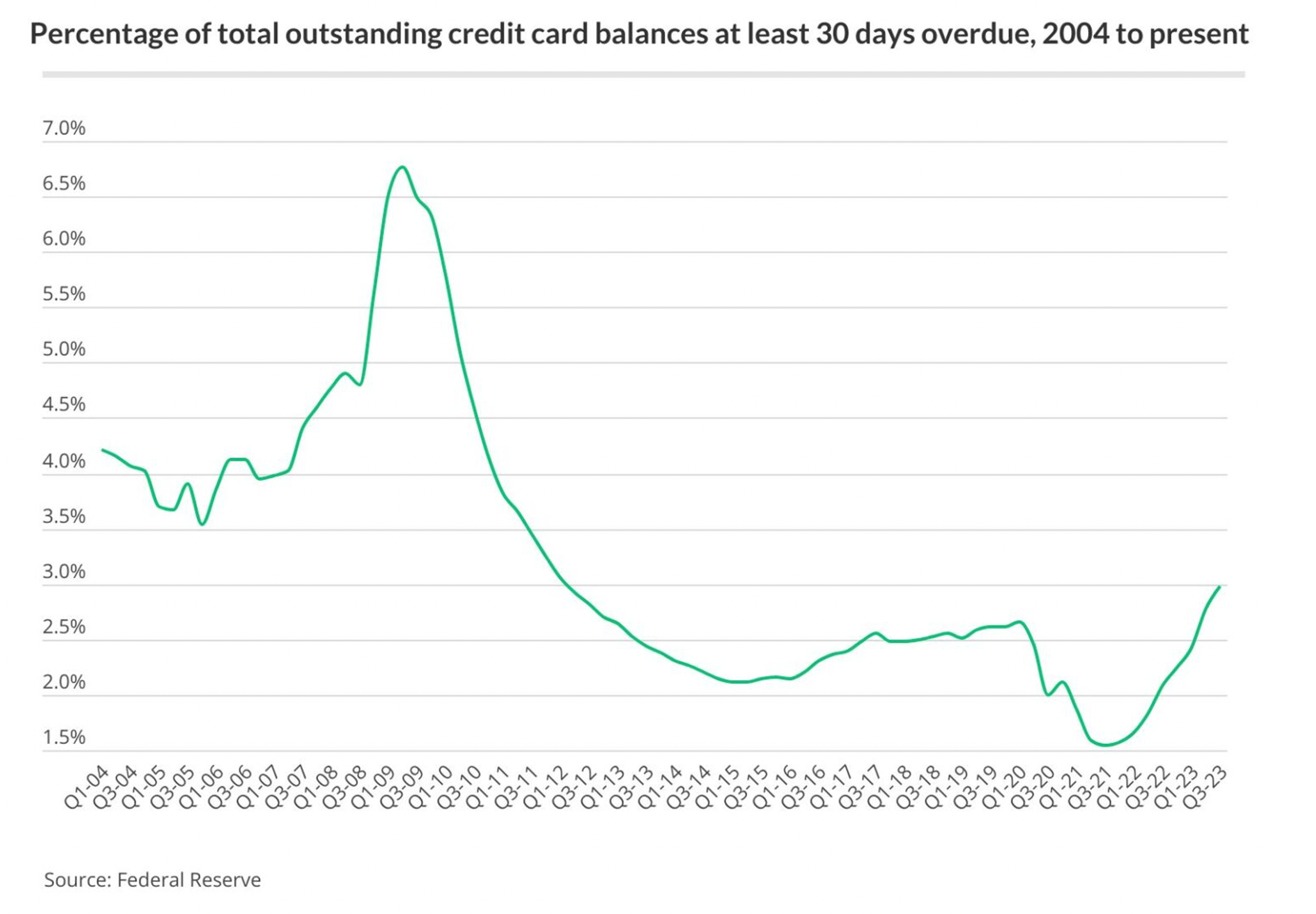 Można zauważyć, że wzrost oprocentowania przyczynił się do wzrostu długu na kartach kredytowych mającego powyżej 30 dni. Niektórzy konsumenci korzystający z kart kredytowych albo mają problemy z ich spłatą, albo utknęli w spirali zadłużenia.