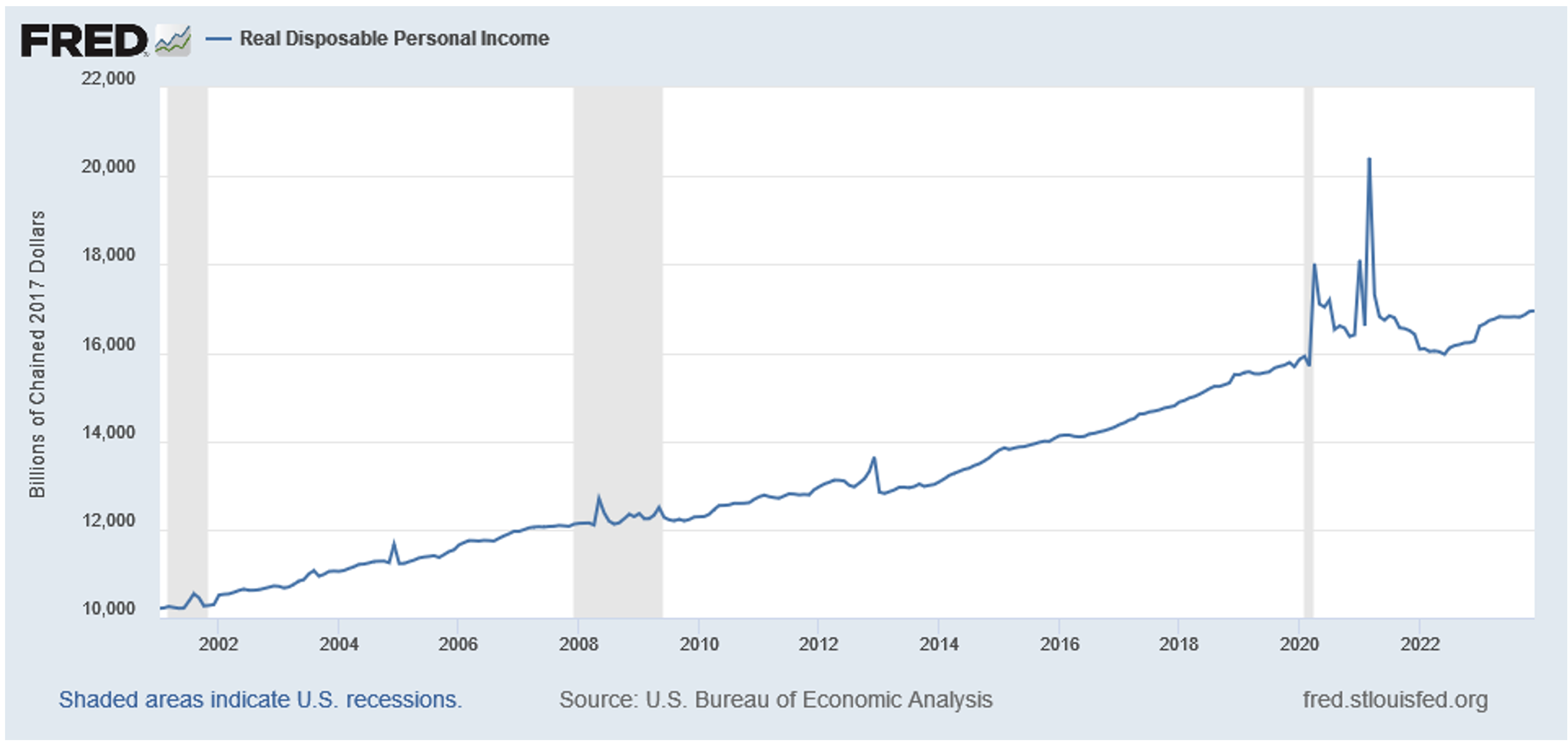 Realny dochód do dyspozycji w USA sugeruje zdolność konsumentów do wydawania pieniędzy. Źródło: https://fred.stlouisfed.org