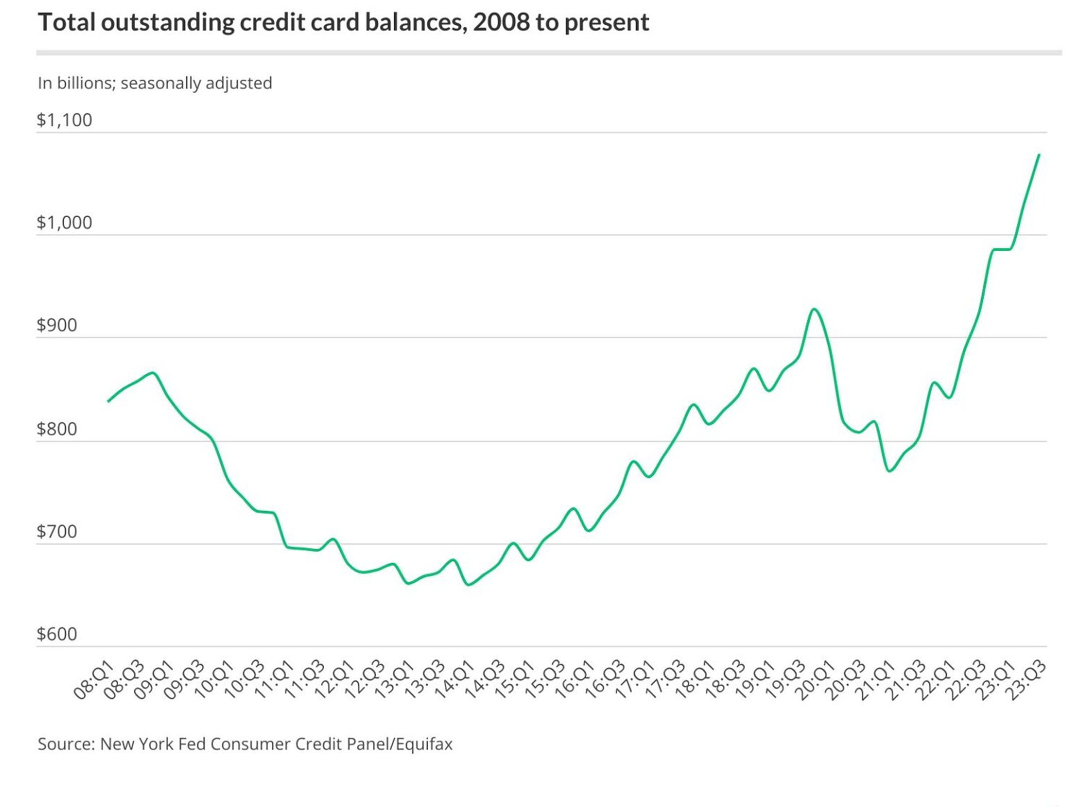 Łączne niespłacone salda na kartach kredytowych. Źródło: https://www.lendingtree.com/credit-cards/credit-card-debt-statistics/