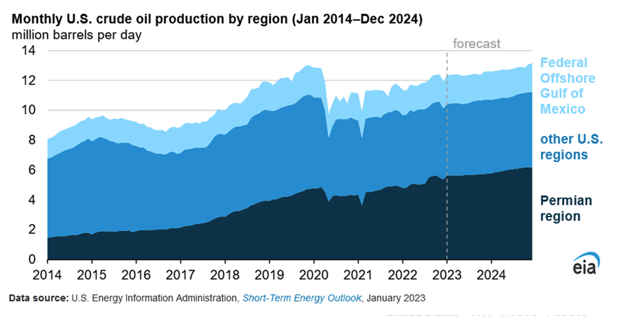 Szczegółowa miesięczna produkcja ropy naftowej w USA. Źródło: EIA