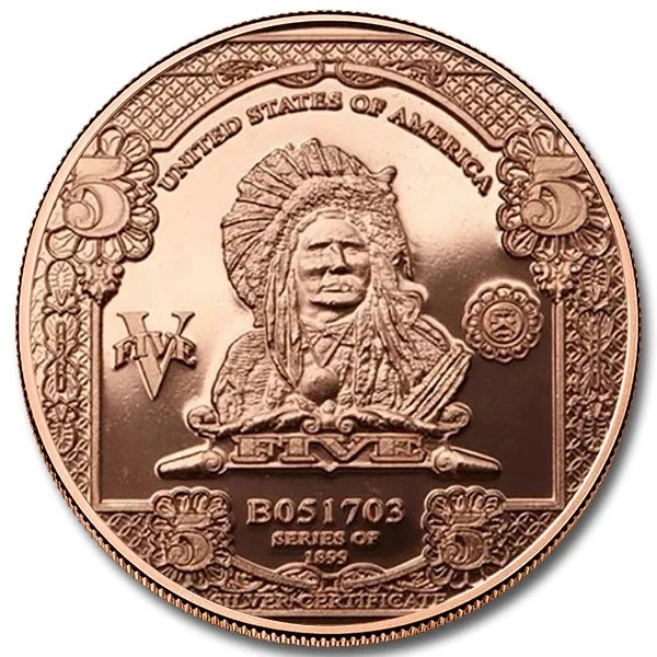 $5 Banknote 1 uncja Miedzi to medal inspirowany słynnym $5 Silver Certificate z 1899 roku, jednym z najbardziej rozpoznawalnych i cenionych amerykańskich banknotów. Kultowy projekt przedstawiający wodza plemienia Hunkpapa Lakota od lat przyciąga kolekcjonerów swoim majestatycznym charakterem. Na miedzianym krążku o masie 1 uncji i czystości .999 wiernie odwzorowano ikonografię pierwowzoru, zachowując jego historyczny styl i bogatą symbolikę.