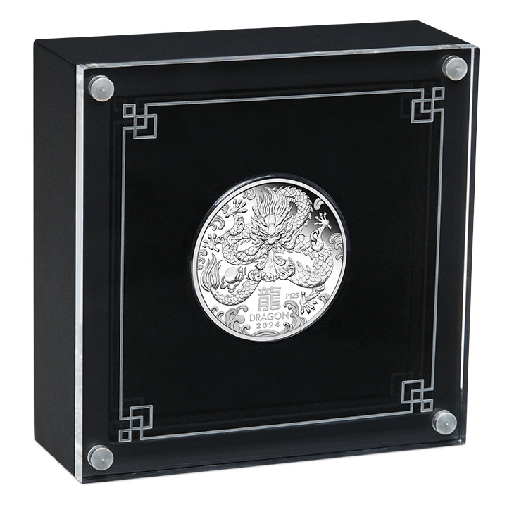 Perth Mint: Lunar III - Rok Smoka 1/2 uncji Srebra 2024 Proof to piąte wydanie serii Lunar III. Poprzednimi monetami z serii był Rok Myszy 2020, Rok Bawoła 2021 oraz Rok Tygrysa 2022, Rok Królika 2023. Księżycowa seria nawiązuje do 12 zwierząt, które są przedstawicielami chińskiego kalendarza lunarnego. Rok 2024 należy do smoka i w mitologii chińskiej jest majestatyczną bestią zamieszkującą rzeki, jeziora, oceany i wędrującą po niebie. Chiński znak zodiaku smoka przypada w latach: 1928, 1940, 1952, 1964, 1976, 1988, 2000, 2012 i 2024.