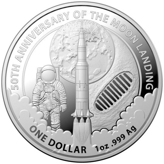 • Srebrna moneta bulionowa 50. rocznica lądowania na Księżycu to produkt pochodzący z Australijskiej mennicy Royal Australian Mint. Moneta o wadzę jednej uncji srebra oraz próbie kruszcu 999 została wybita w limitowanym nakładzie wynoszącym 25 000 sztuk.