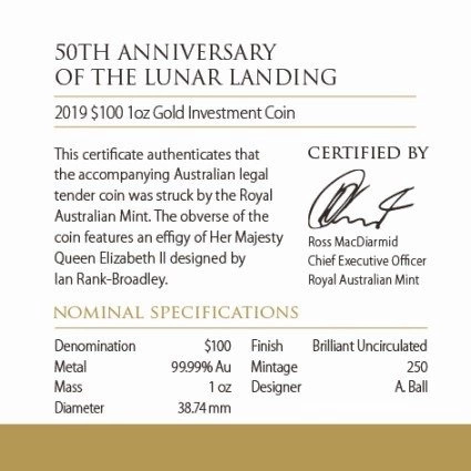 Złota moneta jubileuszowa, upamiętniająca lądowanie na księżycu to jedyny taki unikat dostępny na rynku metali inwestycyjnych. Walor został wykonany ze złota o wadzę 1 uncji trojańskiej oraz czystości kruszcu 9999. Nakład monety wyniósł jedynie 250 sztuk. Za produkcję złotego waloru odpowiada rządowa mennica Royal Australian Mint. Warto dodać, iż Moon Landing 1 oz Gold Coin BU posiada gwarancję rządu Australii co do jej legalności, czystości próby i pochodzenia kruszcu oraz jest pełnoprawnym środkiem płatniczym na terenie Australii. Globalnym dystrybutorem monety jest firma Metal Market Europe - lider obrotu metalami inwestycyjnymi w Europie środkowo-wschodniej.