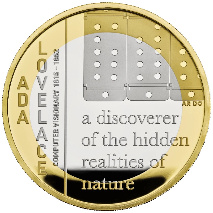Rewers monety przedstawia karty używane do programowania Analytical Engine. Na rewersie znajdują napisy "ADA LOVELACE", "COMPUTER VISIONARY", "1815-1852", "A DISCOVERER OF THE HIDDEN REALITIES OF NATURE". Projektantem rewersu był Osborne Ross.