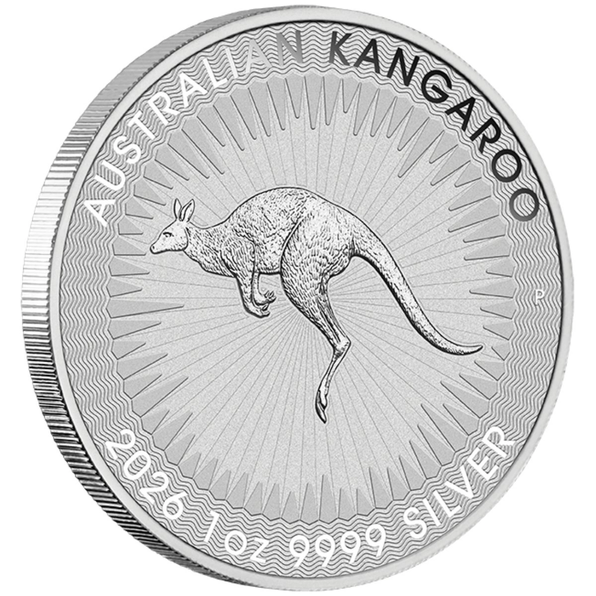 Rewers monety przedstawia klasyczny motyw kangura w dynamicznym skoku, otoczonego promieniami słońca. U góry umieszczono nazwę serii AUSTRALIAN KANGAROO, a na dole rok emisji 2026 oraz informacje o wadze i próbie srebra, podkreślając inwestycyjny charakter waloru i jego znaczenie w kolekcji.