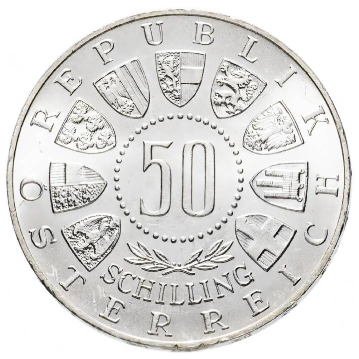Austria: 50 Szylingów – Różne roczniki – srebrne monety kolekcjonerskie emitowane przez Republikę Austrii, głównie w latach 50.–70. XX wieku. Charakteryzują się klasycznym wzornictwem, często nawiązującym do ważnych wydarzeń historycznych oraz wybitnych postaci austriackiej kultury i historii. Monety te są cenione zarówno przez kolekcjonerów, jak i inwestorów w kruszce.