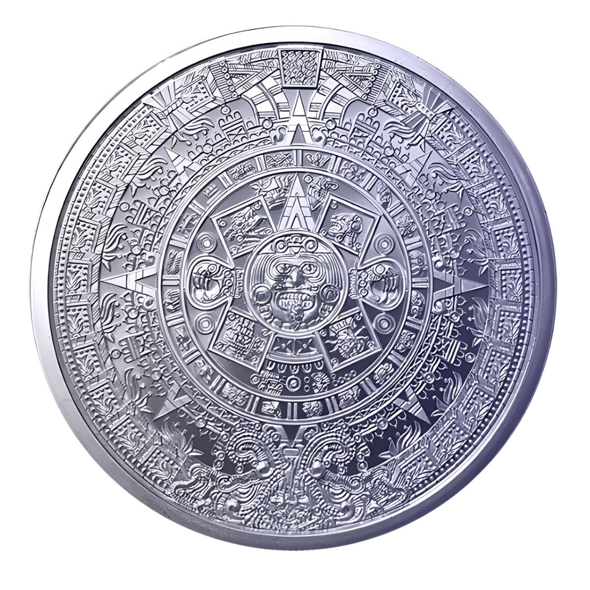 Awers monety prezentuje boga słońca Tonatiu w centrum, otoczonego splecionym wizerunkiem węża, znakiem Xiuhcoatl – węża ognia – który w mitologii azteckiej reprezentuje cykliczną naturę czasu i transformację. Wokół tej centralnej sceny rozciąga się bogata mozaika symboli reprezentujących kosmiczną hierarchię i podział czasu: dwadzieścia znaków dni, cztery poprzednie słońca (epoki) oraz cztery kierunki kardynalne.