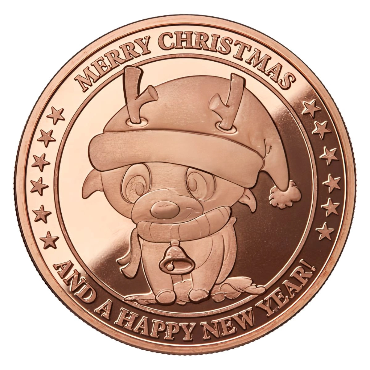 Awers: Przedstawia małego reniferka Rudolfa w czapce Świętego Mikołaja. Wokół centralnego motywu umieszczono napis „MERRY CHRISTMASS” u góry oraz „AND A HAPPY NEW YEAR” u dołu. Po bokach widnieje dwanaście gwiazdek — po sześć z każdej strony.