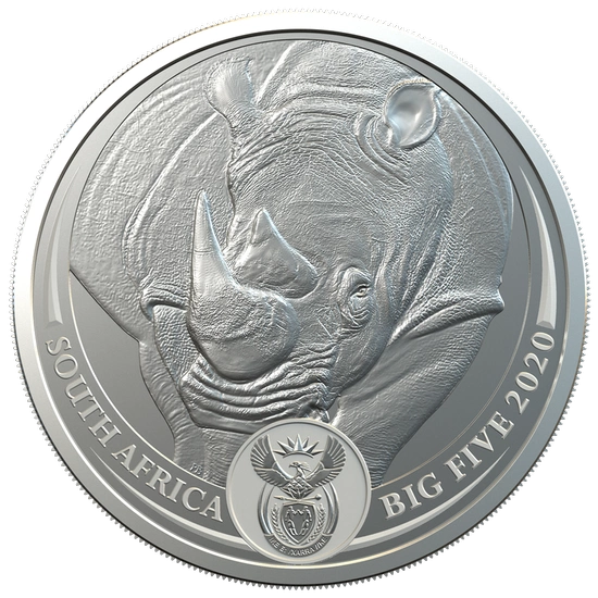 Awers ukazuje głowę nosoroża oraz napis "SOUTH AFRICA", "BIG FIVE 2020" i herb RPA.