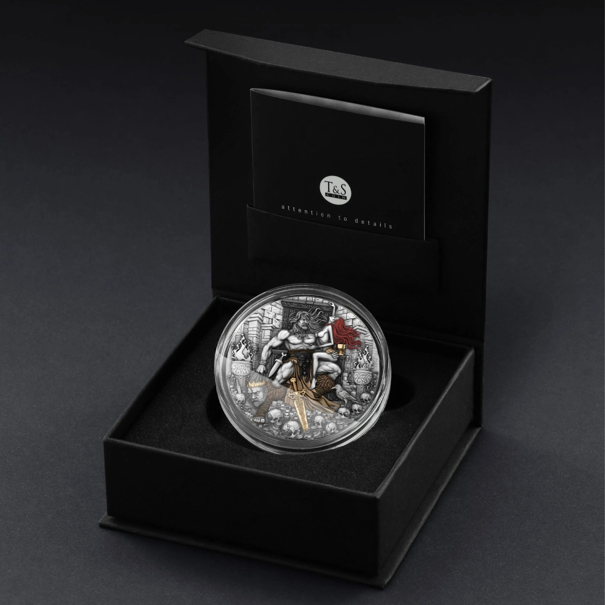 Wykonana z dwóch uncji czystego srebra próby .999 i wykończona w stylu antiqued, moneta łączy w sobie surową estetykę z bogatą symboliką. Selektywne pozłacanie podkreśla kluczowe elementy kompozycji, wzmacniając kontrast między blaskiem władzy a mrokiem zniszczenia. Całość przypomina metaliczną sagę o triumfie, podboju i narodzinach nowego porządku.