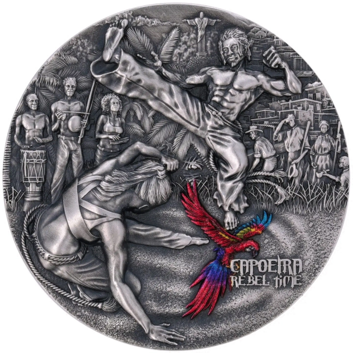 Srebrna moneta Cameroon: Rebel Time: Capoeira kolorowany 2 uncje Srebra 2023 Antiqued Coin to pierwsza moneta z serii "Rebel Time", która zainicjował Maciej Rybicki z Fundacji Start-Sport, mającej swoją siedzibę w Polsce. Fundacja ta, poprzez swoje działania, buduje pozytywne relacje z ludźmi i organizacjami na całym świecie.