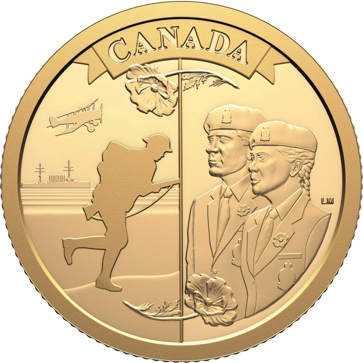 Rewers ukazuje kompozycję symbolizującą ciągłość pokoleniową i pamięć: po lewej stronie widoczna jest sylwetka żołnierza z okresu I wojny światowej na tle okrętów i dwupłatowca, natomiast po prawej stronie znajdują się współczesne wizerunki weterana i żołnierki w mundurach, całość zaś spina centralny motyw maku – symbolu pamięci – oraz wstęga z napisem „CANADA” u góry.