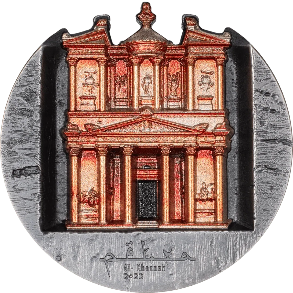 Rewers przedstawia monumentalną fasadę Al-Khazneh odwzorowaną w ultrawysokim reliefie, z realistycznym zróżnicowaniem faktury skalnej i bogatym kolorowaniem.