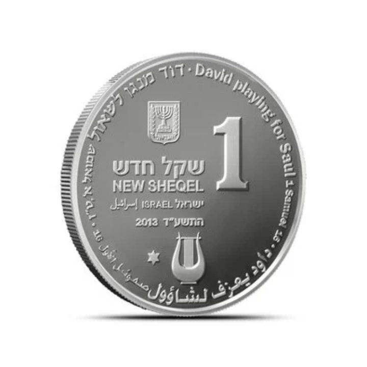 David Playing for Saul 1 NIS Srebro 2013 Prooflike to 18 moneta z serii "Biblical Art". Egzemplarz nawiązuję do historii biblijnej o Dawidzie i Saulu. Obraz Dawida grającego na harfie dla Saula, aby wydobyć go z depresji po odebraniu mu władzy królewskiej, odzwierciedla powstanie i upadek Saula opisane w Księdze Samuela.