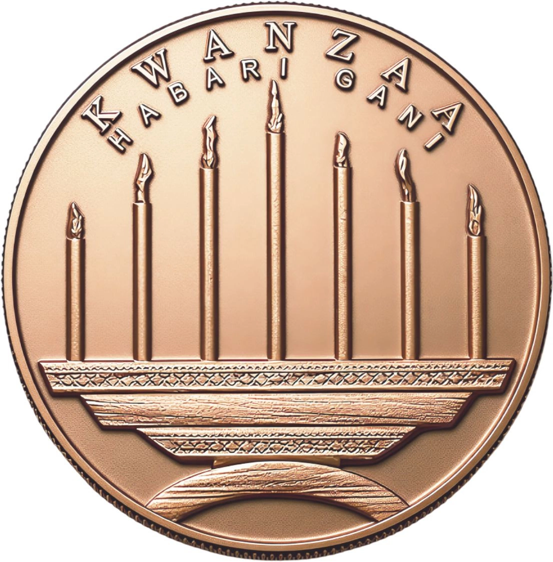 Awers przedstawia stylizowany świecznik kinara z siedmioma smukłymi świecami o płonących płomieniach, ustawiony na dekoracyjnej podstawie z geometrycznym ornamentem, nad którym w otoku umieszczono napis „KWANZAA” oraz hasło „HABARI GANI”, tradycyjną formułę powitalną towarzyszącą obchodom święta.