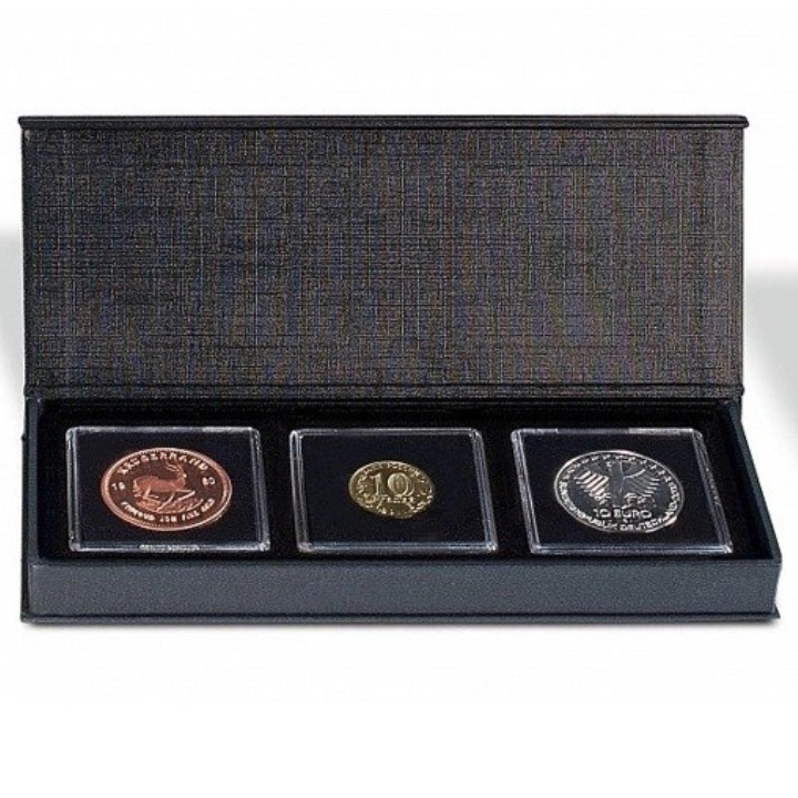Welurowe wnętrze w ciemnogranatowym odcieniu stanowi idealne tło dla cennych numizmatów ze srebra, złota, platyny lub miedzi. Etui Airbox jest przystosowane do przechowywania monet w kapslach Quadrum marki Leuchtturm lub w holderach o wymiarach 50 x 50 mm.