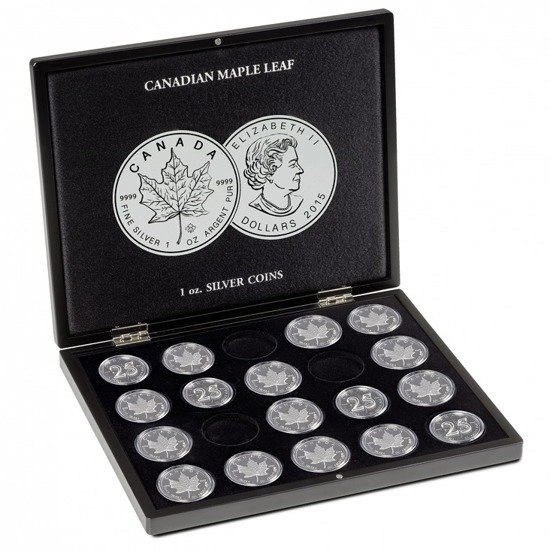Kaseta na monety to sprawdzony i wygodny sposób przechowywania i prezentowania kolekcji walorów. Produkt przeznaczony jest dla 20 srebrnych monet o wadze 1 uncji trojańskiej w plastikowych kapslach, typu Kanadyjski Liść Klonowy.
