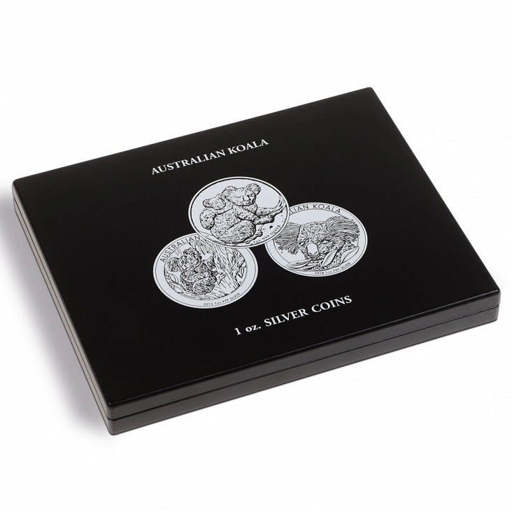 Zakup kasety będzie idealnym rozwiązaniem do przechowywania wszystkich monet Koala, bez względu na rok bicia. Wykonano ją z materiałów najwyższej jakości i z dbałością o każdy detal. Produkt posiada wymiary 305 x 245 x 30 mm. Na pokrywie oraz na wewnętrznej części kasety znajduje się srebrny napis "AUSTRALIAN KOALA 1 OZ SILVER COINS". Wnętrze kasety zostało wysłane satyną oraz posiada zamknięcie magnetyczne. Producentem kasety jest Leuchtturm.