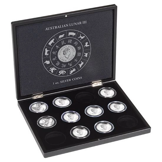 Leuchtturm - Kaseta Lunar III 12 x 1 uncja Srebra to wyjątkowy produkt, który przeznaczony jest na 12 srebrnych monet z serii Lunar III, o wadze 1 uncji trojańskiej w plastikowych kapslach. Do tej pory z serii Lunar III ukazał się cztery walory: Rok Myszy, Rok Bawoła, Rok Tygrysa oraz Rok Królika. Zakup kasety będzie idealnym rozwiązaniem do przechowywania wszystkich monet Lunar III.