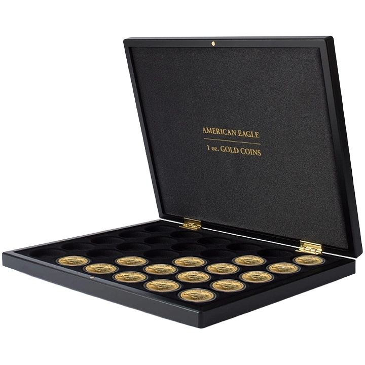 Zakup kasety będzie idealnym rozwiązaniem do przechowywania wszystkich monet Amerykański Orzeł, bez względu na rok bicia. Wykonano ją z materiałów najwyższej jakości i z dbałością o każdy detal. Produkt posiada wymiary 305 x 245 x 30 mm. Na pokrywie oraz na wewnętrznej części kasety znajduje się złoty napis "AMERICAN EAGLE 1 OZ GOLD COINS". Wnętrze kasety zostało wysłane satyną oraz posiada zamknięcie magnetyczne. Producentem kasety jest Leuchtturm.