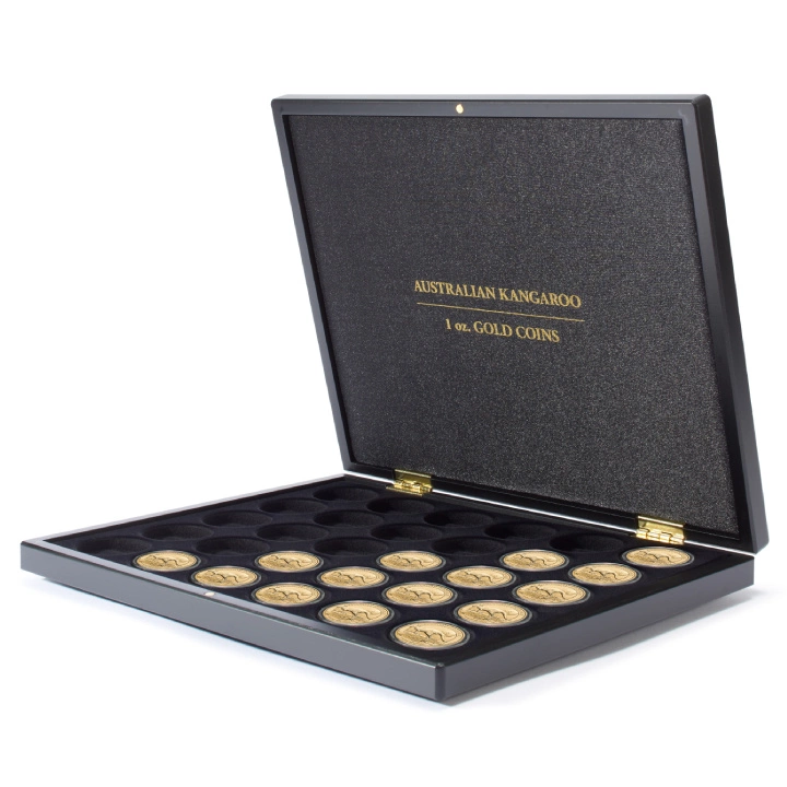 Zakup kasety będzie idealnym rozwiązaniem do przechowywania wszystkich monet Australijski Kangur, bez względu na rok bicia. Wykonano ją z materiałów najwyższej jakości i z dbałością o każdy detal. Produkt posiada wymiary 305 x 245 x 30 mm. Na pokrywie oraz na wewnętrznej części kasety znajduje się złoty napis "AUSTRALIAN KANGAROO 1 OZ GOLD COINS". Wnętrze kasety zostało wysłane satyną oraz posiada zamknięcie magnetyczne. Producentem kasety jest Leuchtturm.