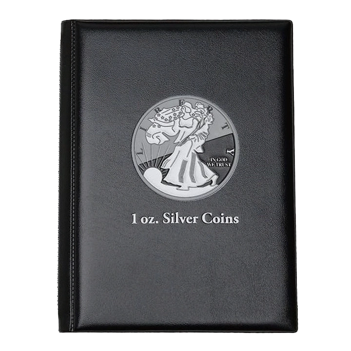 Produkt wykonano z materiału wysokiej jakości. Naszyte przegródki/kieszenie pozwalają na przechowywanie 48 monet o średnicy do 41 mm. Na pokrywie znajduje się srebrny wizerunek personifikacji Wolności - Liberty oraz napis "1 OZ. SILVER COINS"