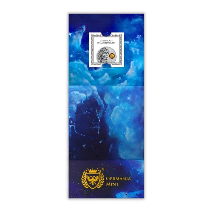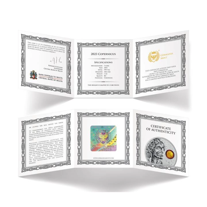 Malta: Copernicus kolorowany 1 uncja Srebra 2023 to unikatowy produkt upamiętnia 550-lecia urodzin Mikołaja Kopernika, wybitnego astronoma, twórcy teorii heliocentrycznej, lekarza, ekonomisty. Jest autorem jednej z wersji prawa rządzącego obiegiem pieniądza - "Gorszy pieniądz zawsze wypiera lepszy".