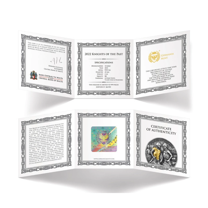 Malta: Knights of the Past pozłacany 2 uncje Srebra 2022 High Relief Antiqued Coin to drugi egzemplarz, który nawiązuje do tradycji Zakonu Maltańskiego oraz do najsłynniejszego oblężenia Malty przez Imperium Osmańskie w 1565 roku. Wydarzenie jest uznawane za przełomowy moment w historii tego państwa oraz Europy.