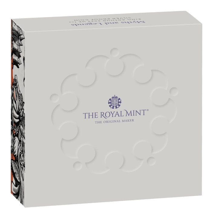 Srebrna moneta Myths & Legends: King Arthur 1 uncja Srebra 2023 Proof ukazuje władcę historycznej Brytanii Króla Artura, bohatera niezliczonej liczby legend, dzieł literackich i filmów. Znany jest między innymi ze słynnego dzieła "Rycerze okrągłego stołu".
