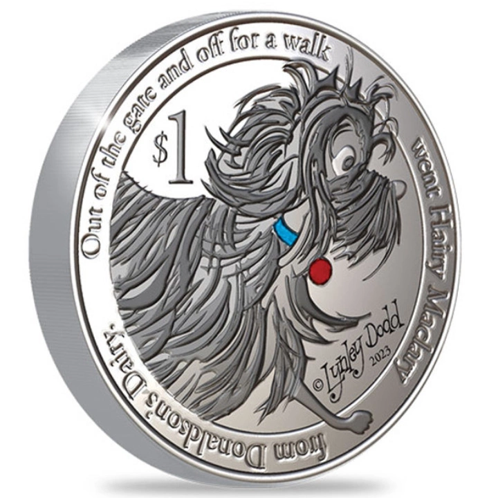 Kolekcjonerski numizmat New Zealand: Hairy Maclary from Donaldson’s Dairy kolorowany Miedzionikiel 2023 to wyjątkowa moneta upamiętniająca 40. rocznicę powstania serii książek "Hairy Maclary z Donaldson’s Dairy", napisanej i zilustrowanej przez Dame Lynley Dodd.