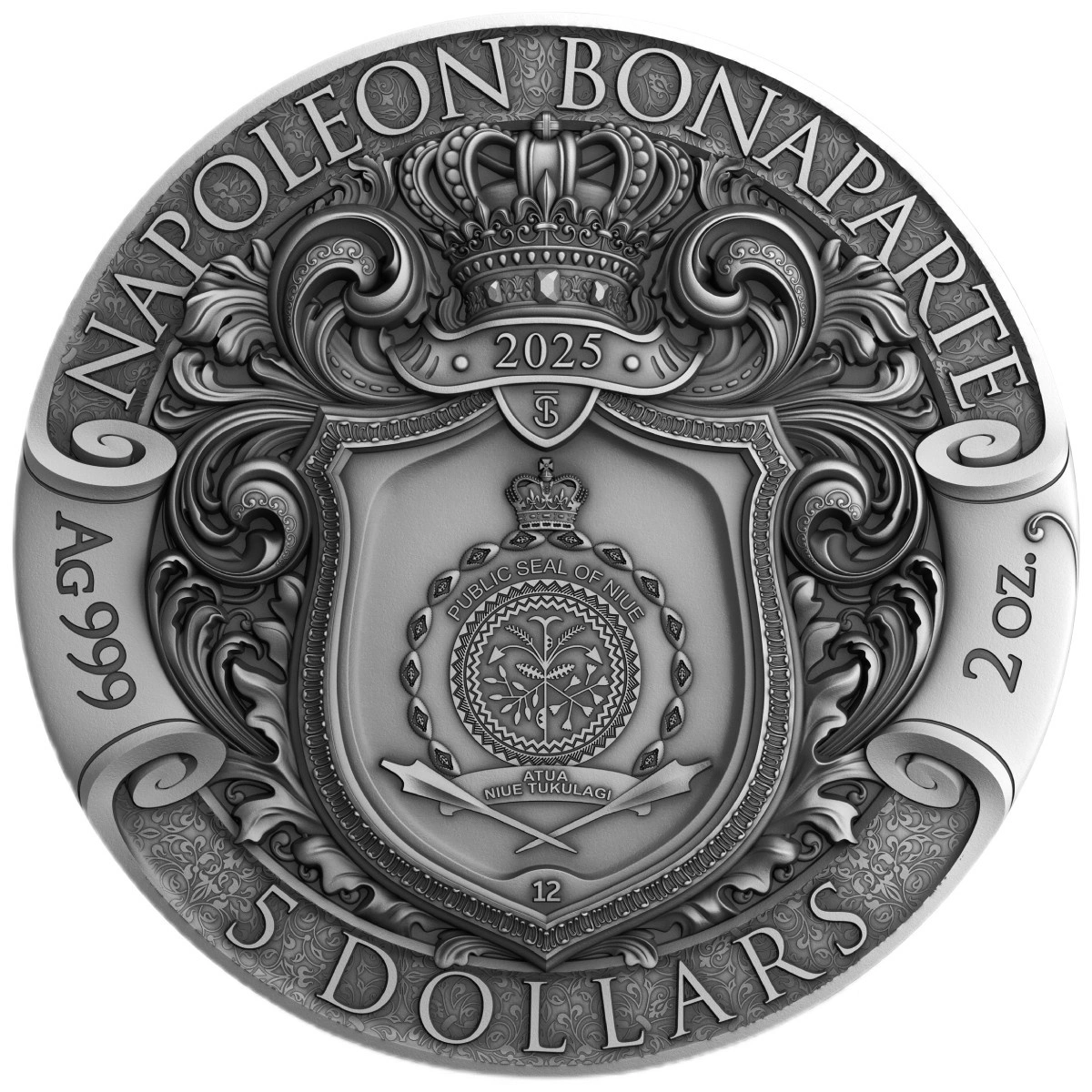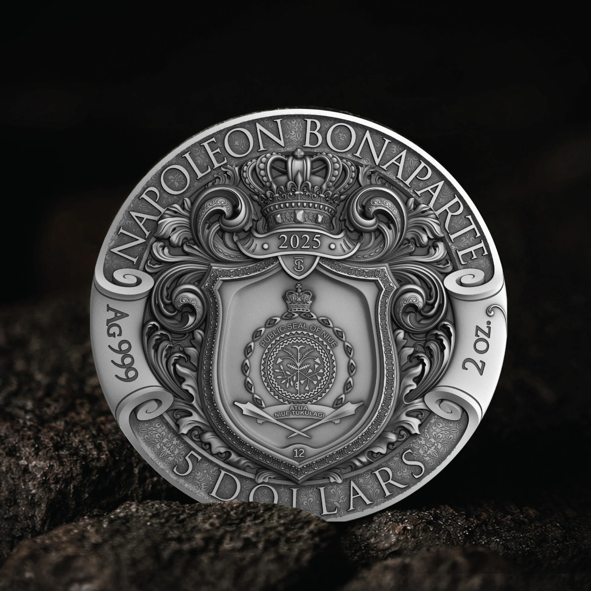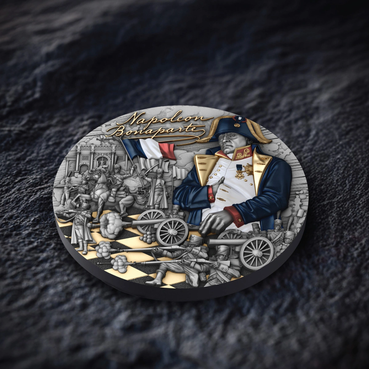Niue: Visionaries in History – Napoleon Bonaparte pozłacany 2 uncje Srebra 2025 Antiqued Coin to pierwsza emisja z serii Visionaries in History, poświęconej wybitnym postaciom, które swoją determinacją i wizją zmieniały bieg dziejów. Napoleon Bonaparte – jeden z najwybitniejszych dowódców wojskowych w historii – stał się symbolem ambicji, strategii i niezłomnej woli. Od generała do cesarza Francji, zasłynął mistrzostwem taktycznym, innowacyjnym podejściem do sztuki wojennej oraz zdolnością adaptacji w zmiennych realiach politycznych i militarnych.
