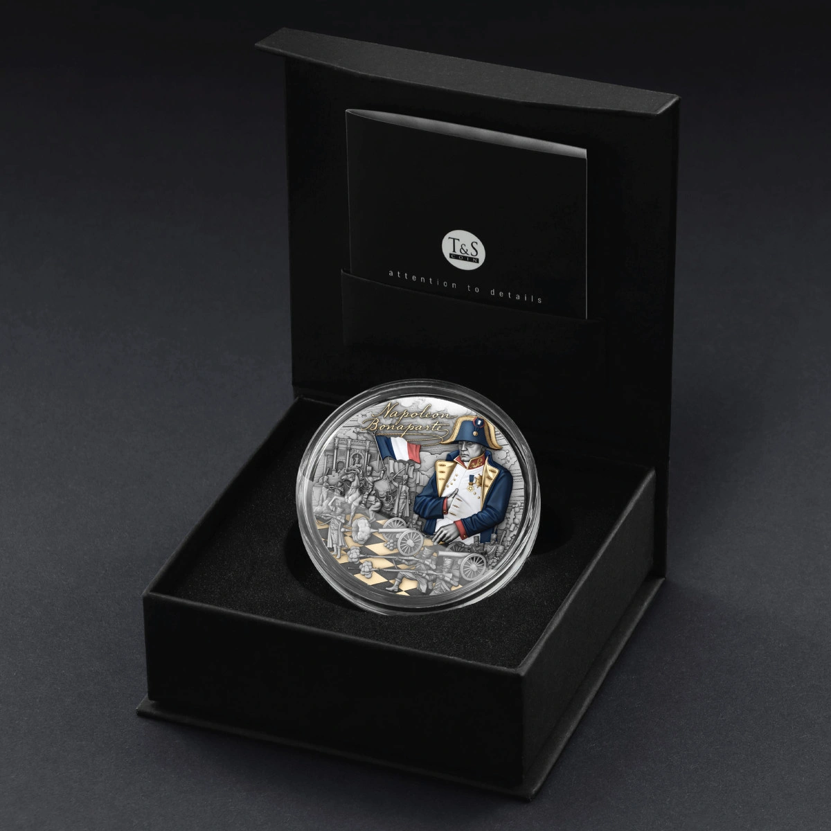Srebrna moneta kolekcjonerska oddaje charakter epoki i osobowość Bonapartego poprzez bogaty relief, selektywne pozłacanie oraz wykończenie typu antiqued. Stanowi hołd dla dyscypliny, odwagi i konsekwencji w dążeniu do celu, przypominając, że prawdziwa wielkość rodzi się z wytrwałości, a nie z przypadku.