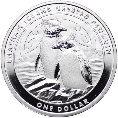 Rewers srebrnej monety zdobi wizerunek pary pingwinów czubatych, stojących na skale na tle oceanu. W tle głównego wizerunku, można również zauważyć nowozelandzki wzór „koru” nawiązujący do kształtu zwiniętego liścia paproci. Całość okala napis „Chatman Island Crested Penguin". Za projekt rewersu odpowiada Dave Burkle.