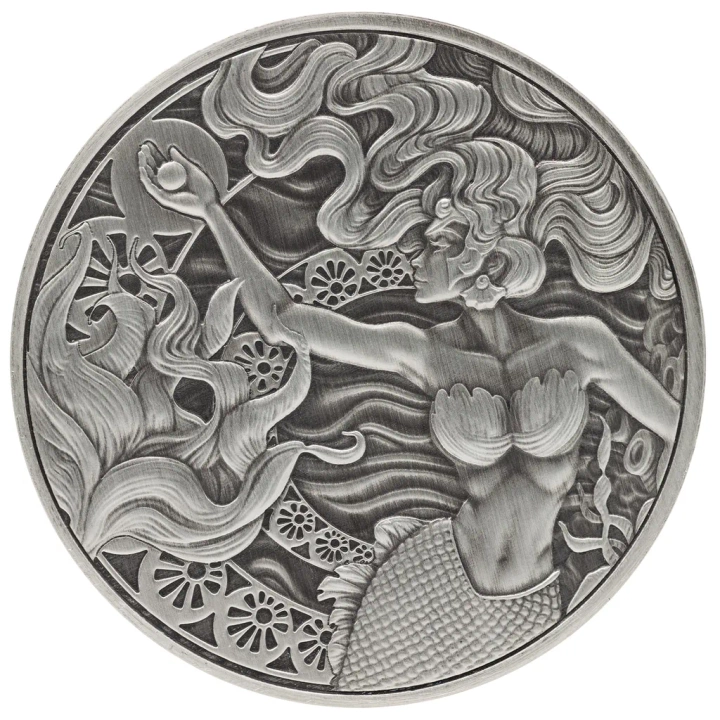 Rewers ukazuje legendarną syrenę z falującymi włosami sięgającą po świecącą perłę. Tło zostało ozdobione detalicznymi falami i motywami inspirowanymi koralami, co nadaje kompozycji głębię i dynamikę. Każda linia i krzywa została starannie wybita, podkreślając piękno srebra i precyzję wykonania, czyniąc tę monetę wyjątkowym dziełem numizmatycznym.