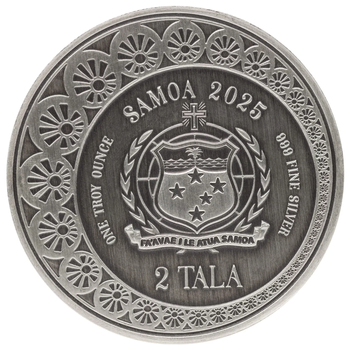 Awers przedstawia herb Samoa, z podanym rokiem emisji – 2025, wartością nominalną – 2 Tala oraz informacją o wadze i próbie srebra. Całość utrzymana jest w harmonijnym stylu, podkreślającym status monety jako legalnego środka płatniczego oraz kolekcjonerskiego waloru.