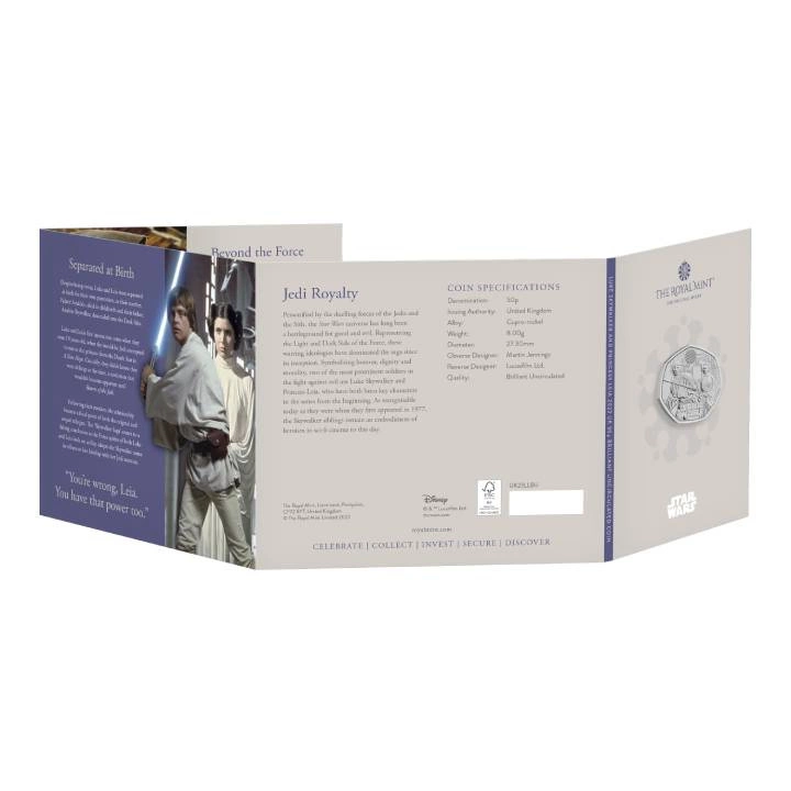 Star Wars: Luke Skywalker and Princess Leia 50p Miedzionikiel 2023 to trzecia moneta z serii "Star Wars". Walor jest numizmatycznym unikatem dla fanów ikonicznej sagi kosmicznej. Gwiezdne Wojny to fikcyjne uniwersum stworzone przez George'a Lucasa. Pierwszy film miał premierę w 1977 roku. Produkt prezentuje Luke'a Skywalker'a i Księżniczkę Leia'ę - dwie kluczowe postacie, które odgrywają kluczową rolę w sadze Star Wars.