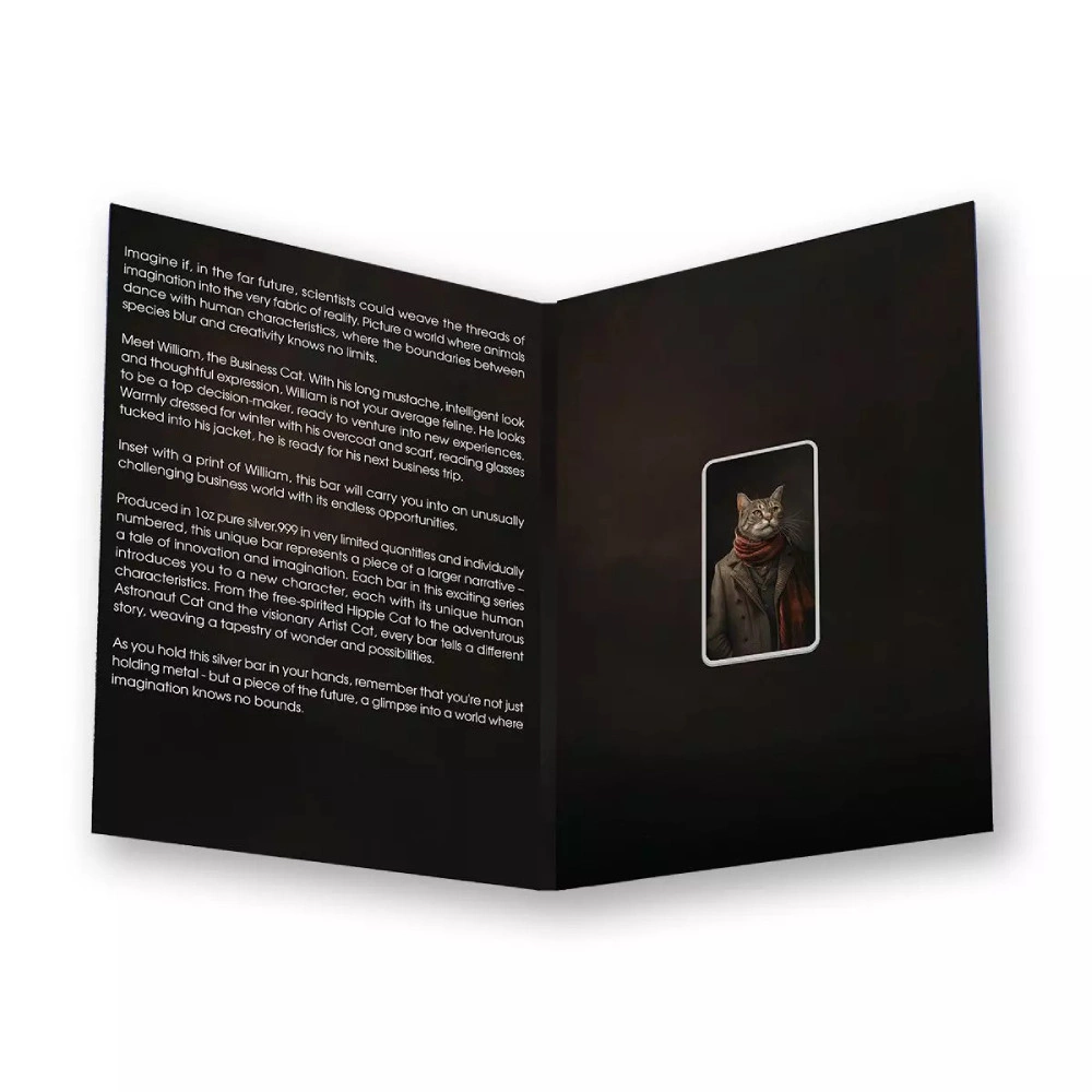 The Holy Land Mint - Human Cats - William kolorowana 1 uncja Srebra 2025 przedstawia Williama, Kota Biznesu. Charakteryzuje go długi wąs, przenikliwe spojrzenie i zamyślony wyraz twarzy. William to zdecydowanie nie jest zwykły kot. Emanuje pewnością siebie doświadczonego decydenta, zawsze gotowego do podejmowania nowych przedsięwzięć. Ubrany w elegancki płaszcz i szalik, jest gotowy na kolejną wielką biznesową przygodę.